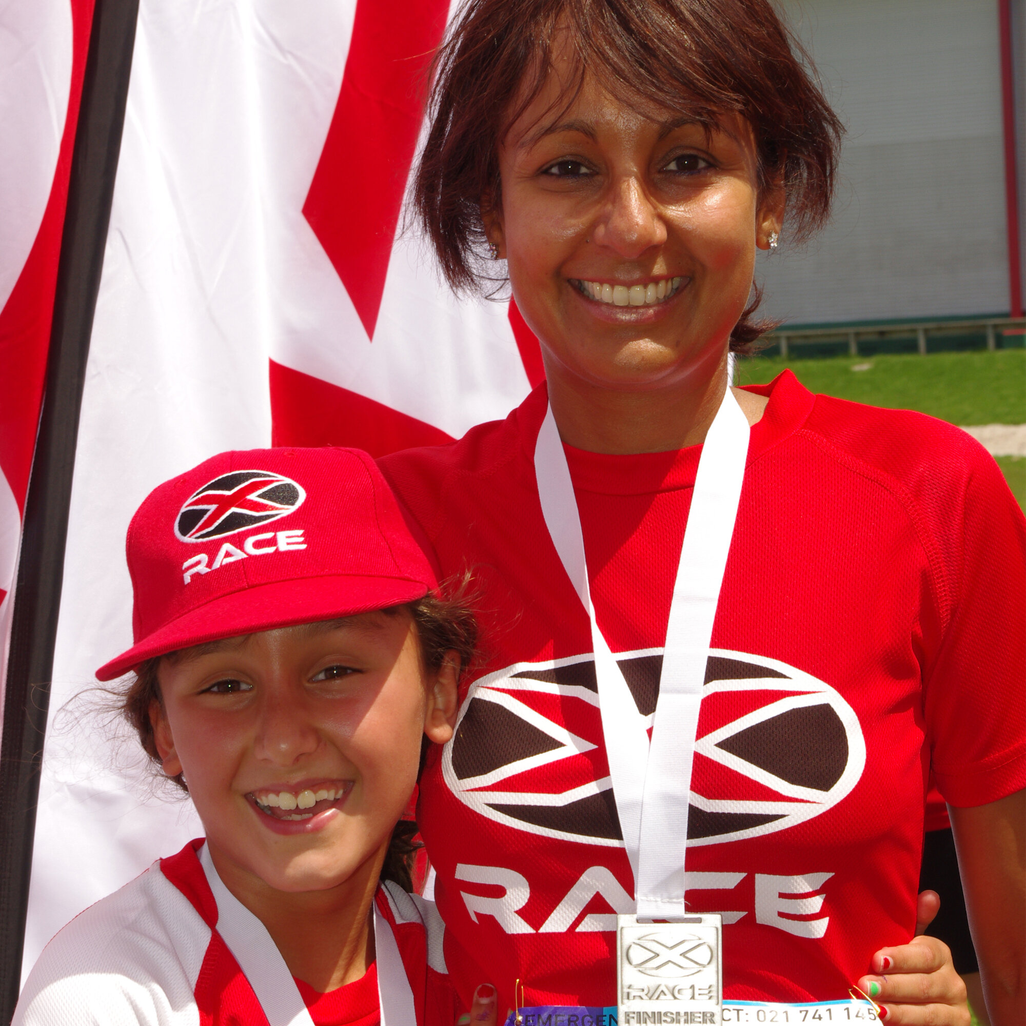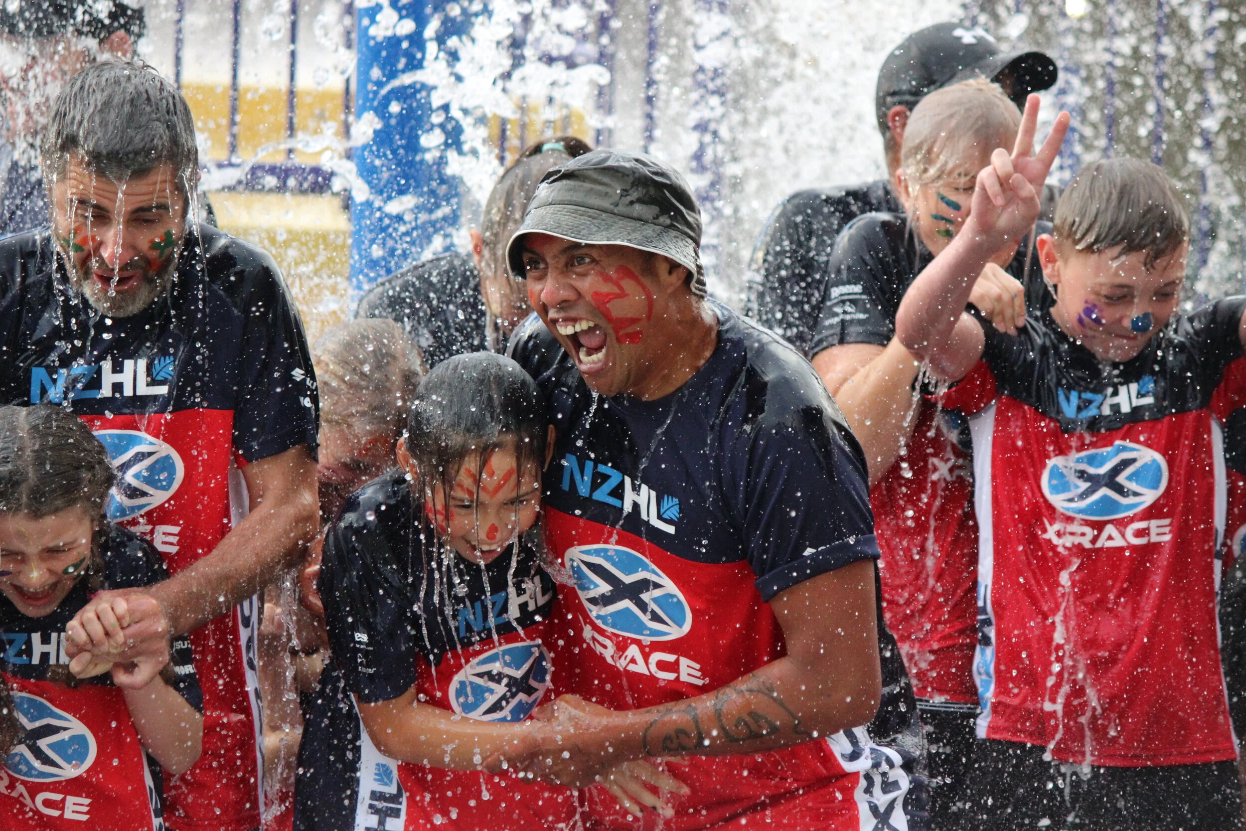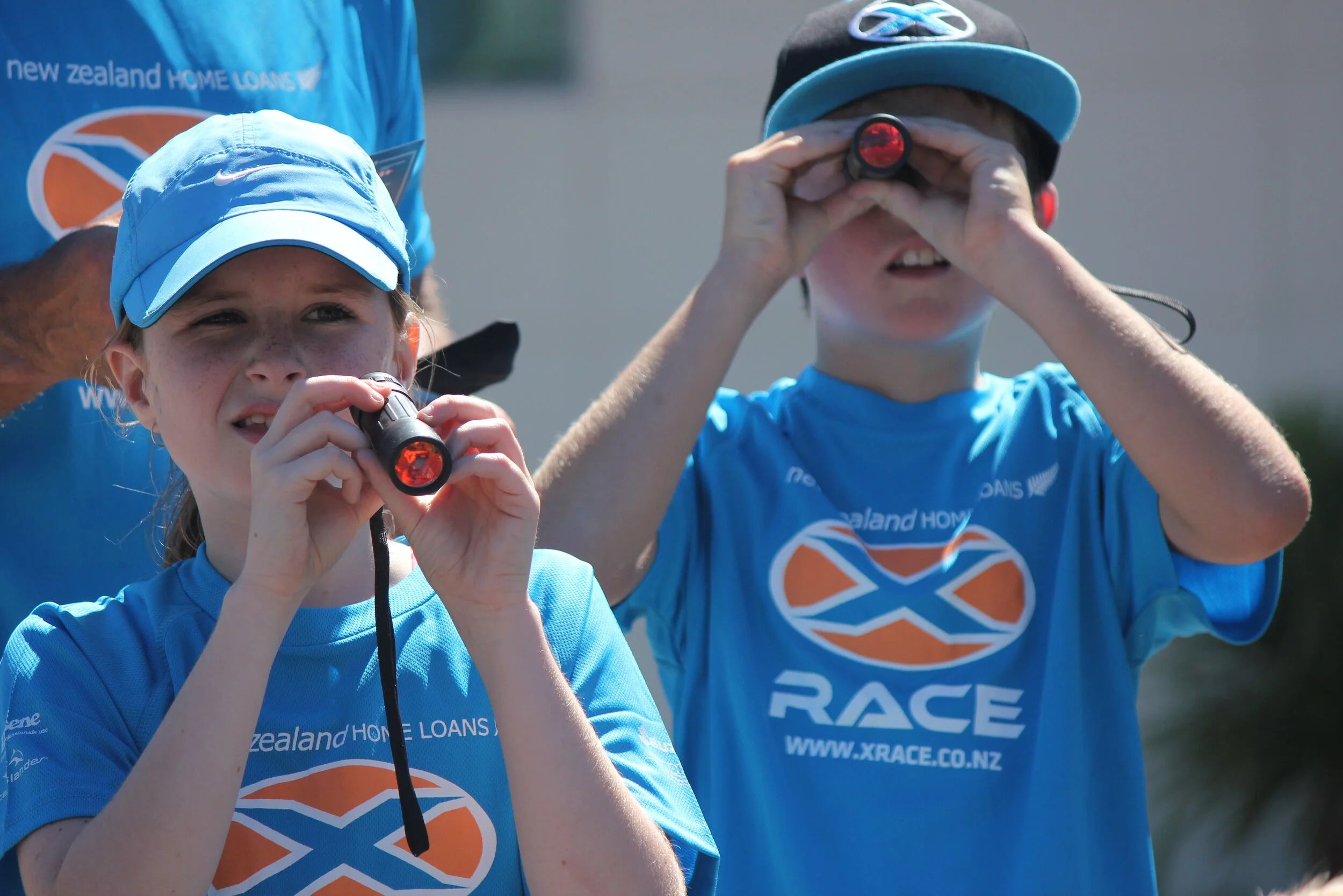 The red shirts.